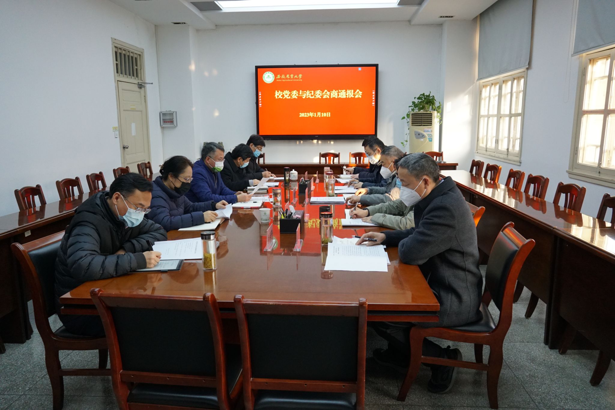 本网讯 1月10日,校党委与纪委围绕“推动党的二十大精神在学校落实见效”主题召开会商会。会议由校党委书记常业军主持,校党委常委,校纪委书记、监察专员,纪委副书记,党政办、纪委办主要负责同志参加会议。