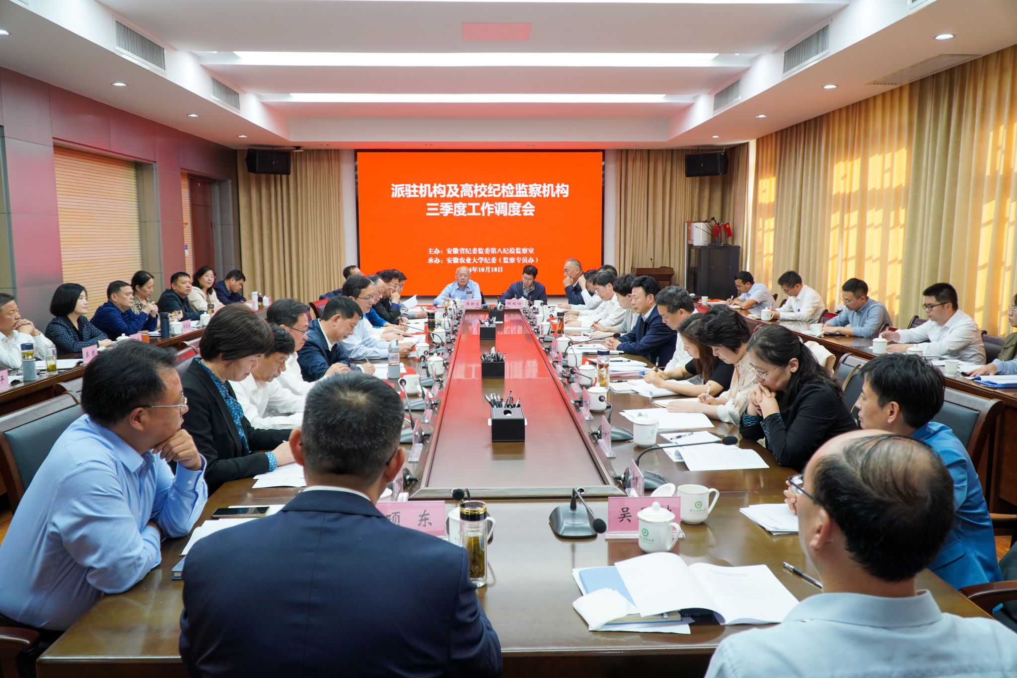 本网讯 10月18日,省纪委监委第八纪检监察室联系的派驻机构暨高校纪检监察机构2024年三季度工作调度会在我校召开。省纪委副书记、省监委副主任桂青出席会议并讲话。校党委书记张庆亮致辞。省纪委监委第八纪检监察室,驻省教育厅纪检监察组等4家派驻机构,中国科学技术大学、合肥工业大学和30所省属本科院校纪检监察机构负责同志参加会议。