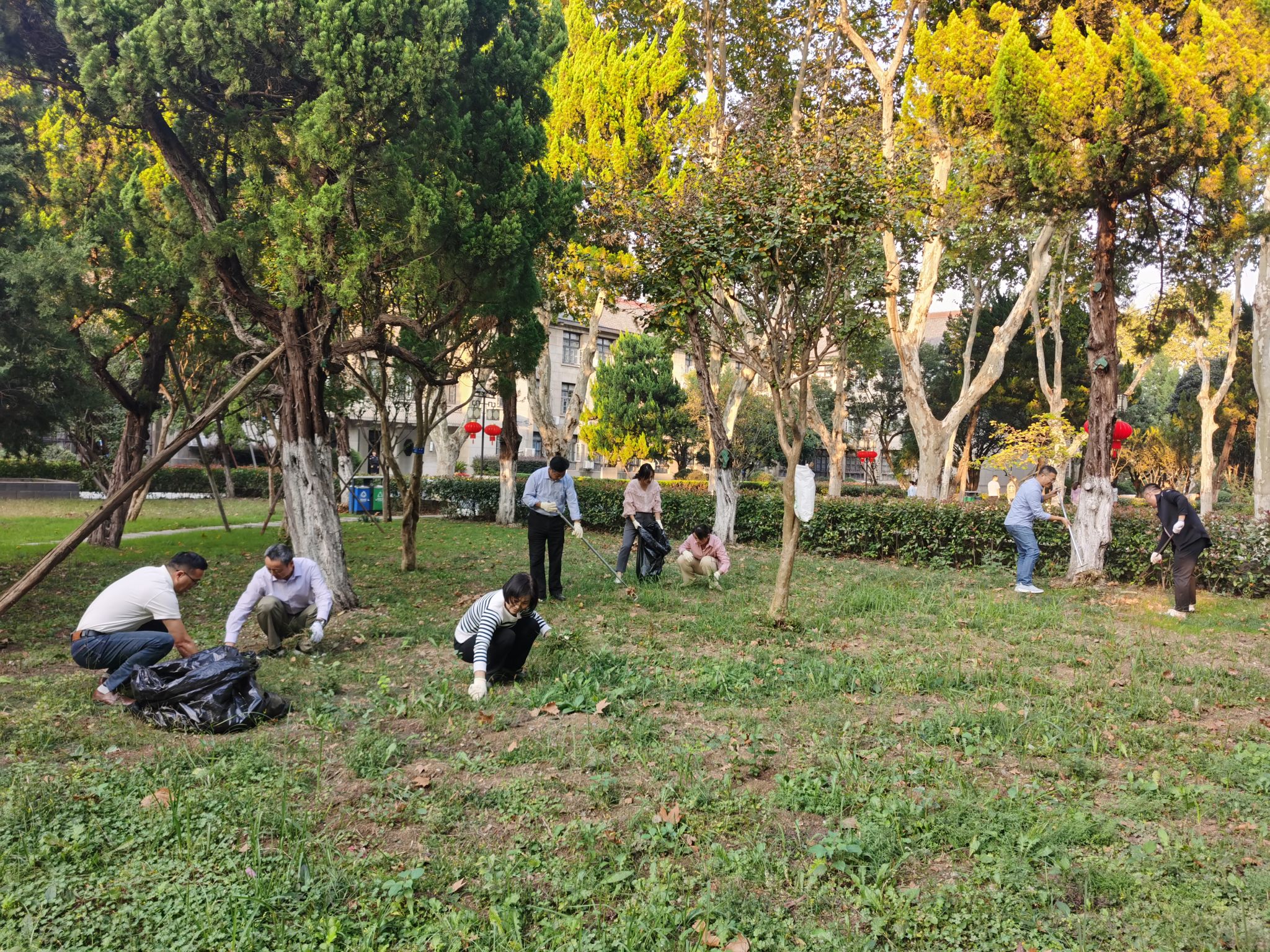 会后,全体党员前往支部环境卫生责任区清除杂草垃圾、清理枯枝落叶,以干净整洁的卫生环境迎接95周年校庆、欢迎校友回校。
